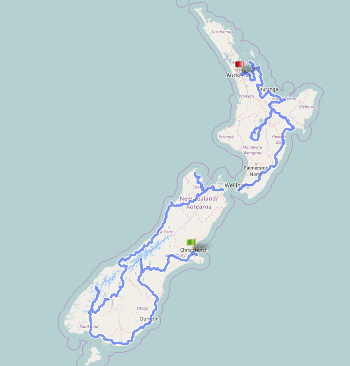 Die Route, welche wir in Neuseeland abfahren wollen, steht auch schon soweit. Diese stammt von einem anderen Radtouristen, der die Strecke bereits abgefahren ist. Insgesamt etwas über 4800km...